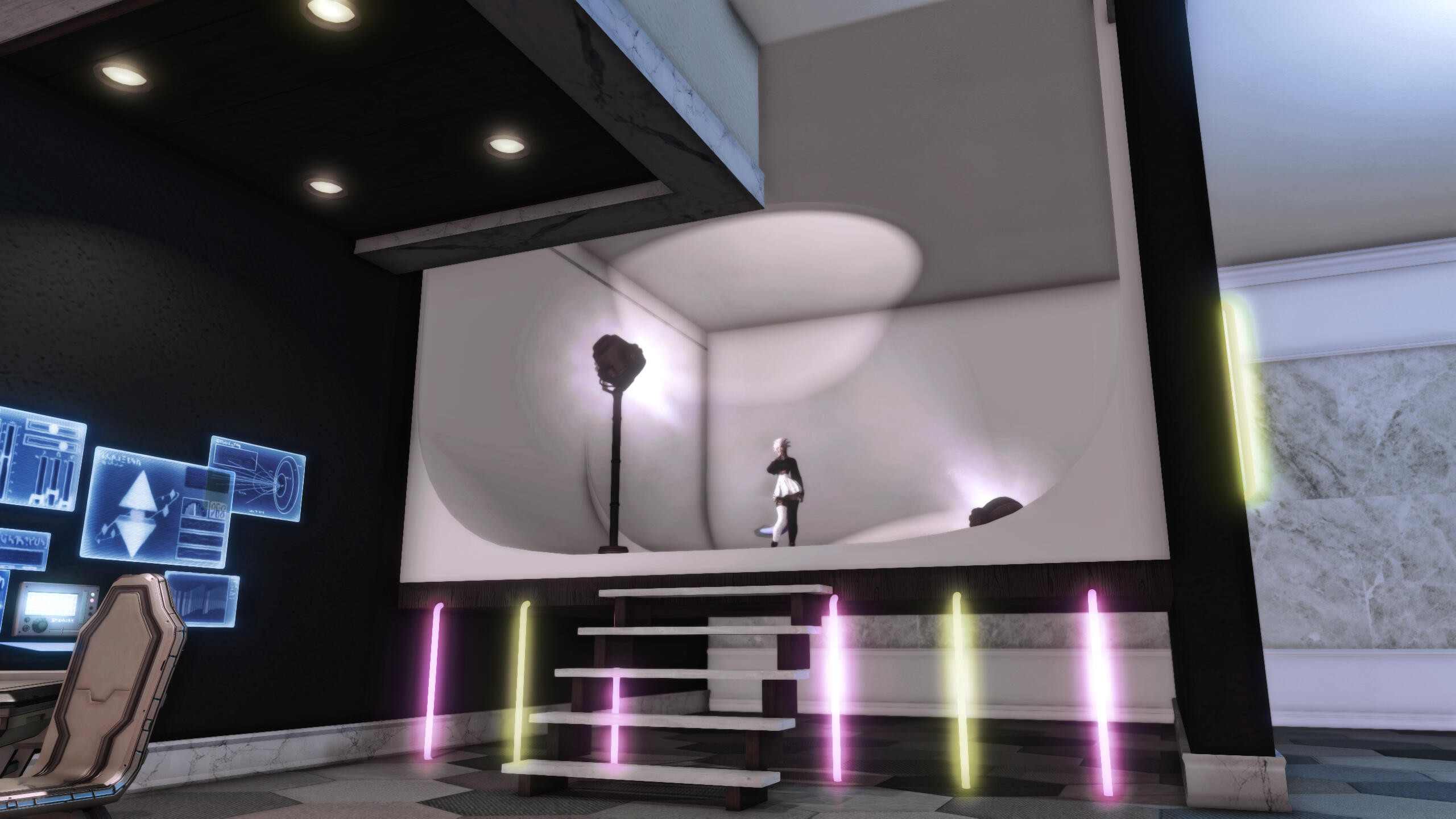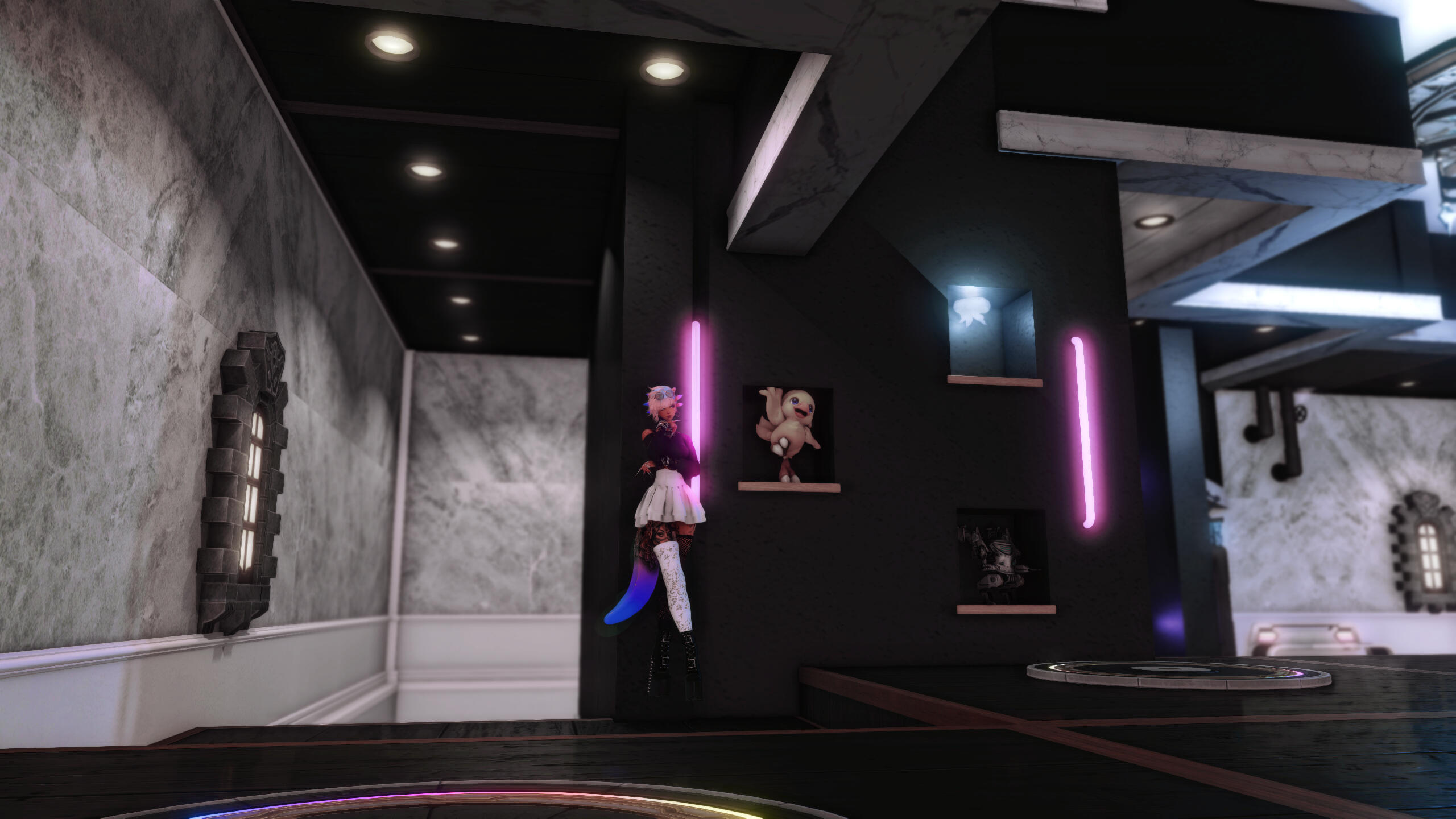 Residing in Ishgard, K’halamiti now works at the private club Apocrypha, owned by Xia Dove. Known to patrons as the Apocry-pet, she performs as a living emblem of discipline and trust, blending draconic grace with mortal vulnerability.